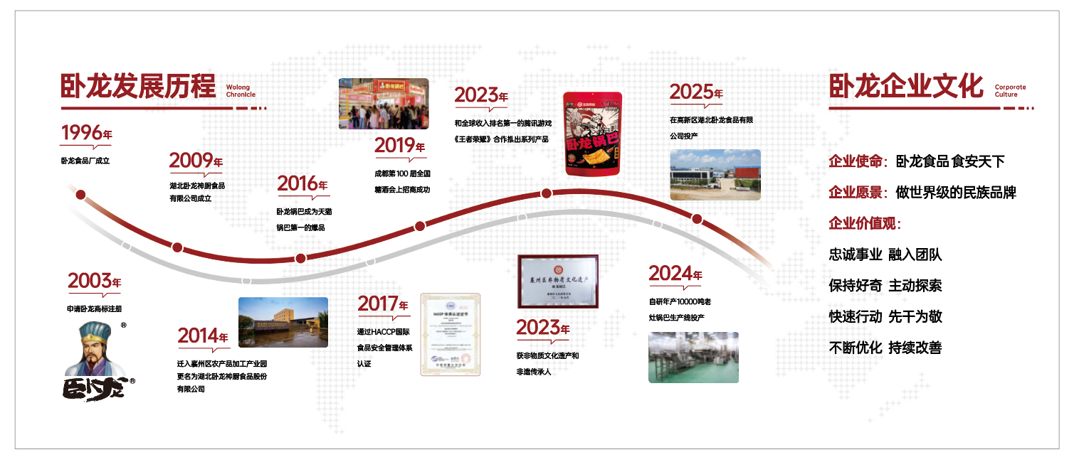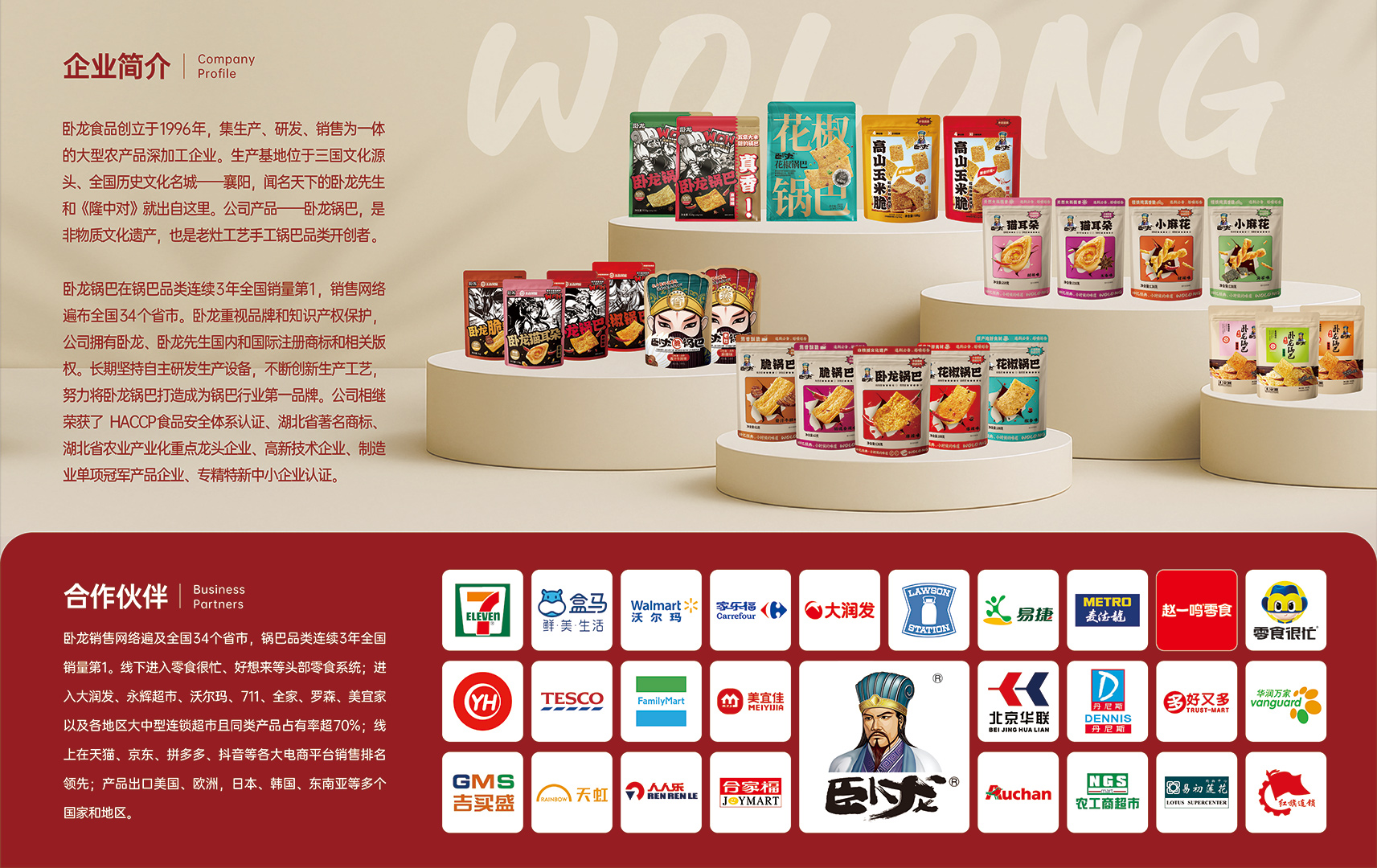 ? ? ? ? ?湖北臥龍神廚食品股份有限公司成立于1996年,是集生產研發銷售為一體的專業生產膨化休閑食品企業,是手工鍋巴老灶工藝開創者。生產基地位于三國文化源頭、全國歷史文化名城--襄陽,聞名天下的臥龍先生和《隆中對》就出自這里。
