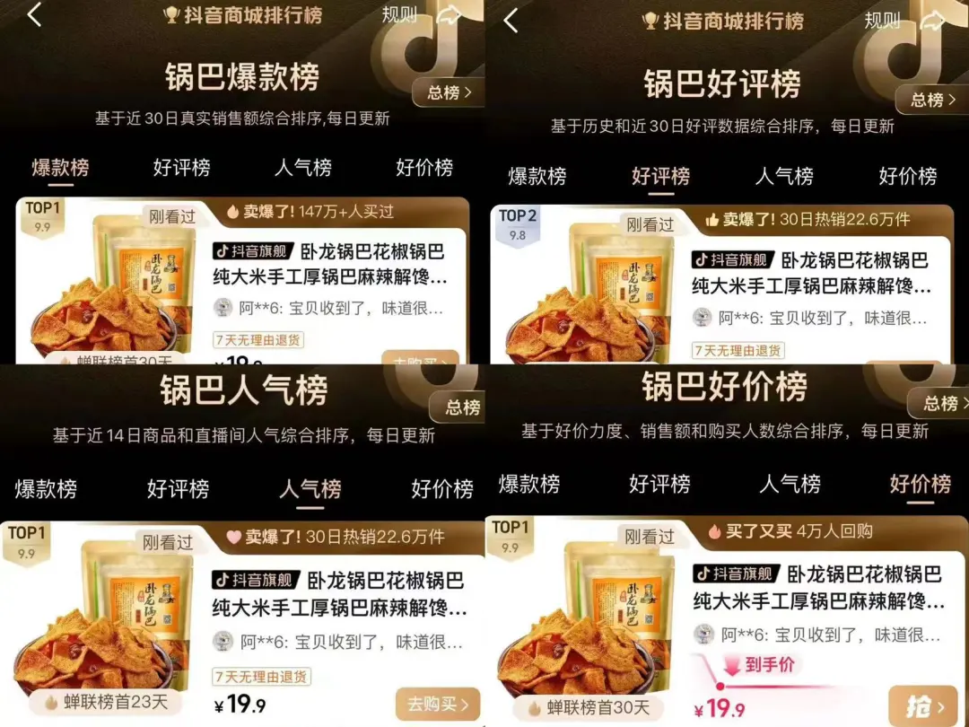 據(jù)抖音商城最新一期鍋巴人氣榜、爆款榜、好價榜,好評榜排名顯示。臥龍公司以“臥龍鍋巴、花椒鍋巴”兩大單品包攬人氣榜、爆款榜、好價榜TO1,是當之無愧的行業(yè)領(lǐng)軍者。